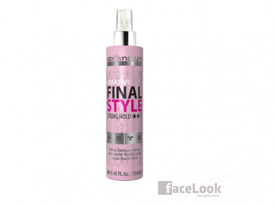 Abril et nature creative final style strong hold. Un spray sin gas, que permite fijar el cabello con una fijación fuerte. Formula de secado rápido, con protección térmica. Con aceite de argán y activo exclusivo plex, que repara la fibra capilar y evita la rotura del cabello. Tiene una fijación y una alta resistencia a la humedad, con lo que aseguramos, un efecto anti encrespamiento de larga duración. Permite fijar todo tipo de peinados creativos.