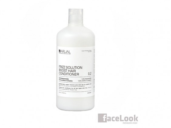 Arual frizz solution 0.2 acondicionador para cabellos encrespados. Acondiciona e hidrata, al mismo tiempo que reduce el encrespamiento. Su complejo antifrizz, se encarga de suavidad la cutícula del cabello, evitando el encrespamiento y dejando una textura muy manejable. La glicerina, se encarga de mantener el cabello húmedo y de retener la humedad, para conservarlo hidratado y reducir el encrespamiento. Con la línea Arual solution antifrizz, los resultados se notan desde la primera aplicación. Es capaz de modificar la estructura del cabello, consiguiendo en tan solo 10 aplicaciones, que desaparezca el encrespamiento, sin necesidad de usar la plancha.