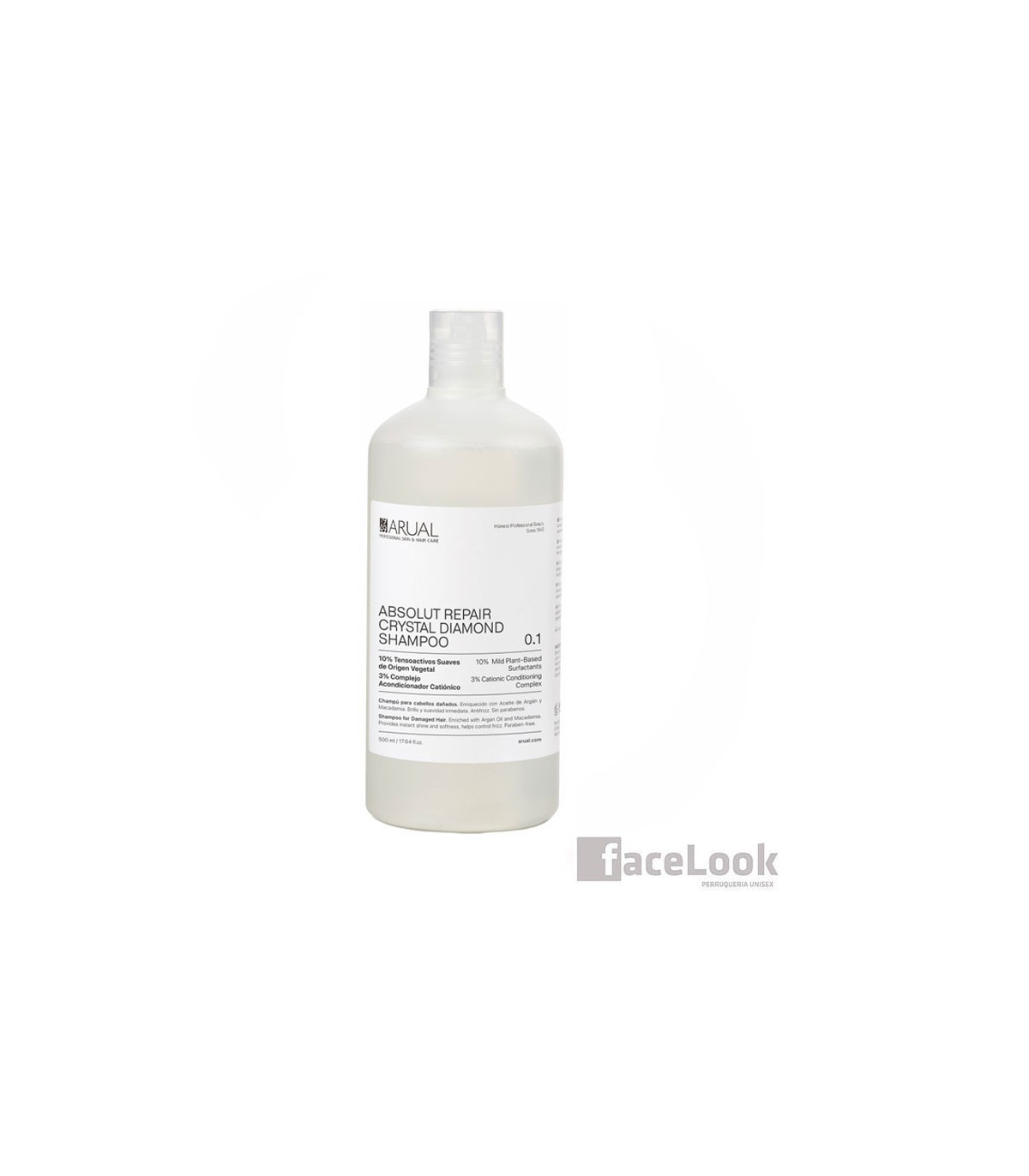 Arual crystal diamond 0.1 champú reparador. Ideal para cabellos que se rompen, con falta de brillo, resecos o debilitados. Sus aceites vegetales, el aceite de argán y de macadamia, tienen un efecto reparador y de puntas abiertas. Tratamiento para cabellos dañados, ya que repara en profundidad y acondiciona. Su complejo acondicionador catiónico, forma una película, en la cutícula capilar, que reduce la fricción. Proporciona un efecto anti encrespamiento, con brillo y sano.
