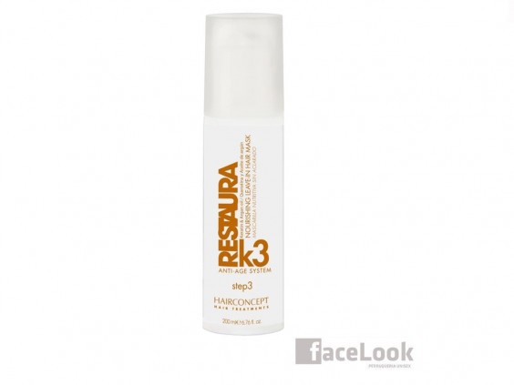 Hair concept restaura k3. Mascarilla capilar sin aclarado, que nutre inmediatamente, siendo de acción prolongada. Sus activos hidratan, protegen y recuperan la fibra capilar del cabello. Entre su composición se encuentra la vitamina E, proteínas vegetales hidrolizadas, queratina hidrolizada y el aceite de argán. Aporta brillo, suavidad y textura, facilitando el peinado inmediatamente. No contiene ni parabenos, ni colorantes.