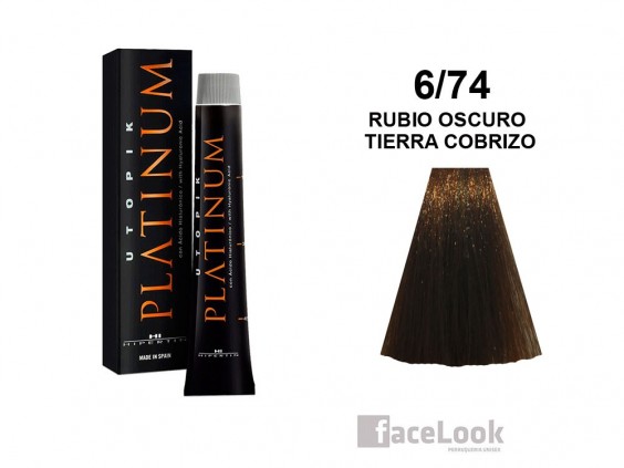 Tinte de pelo hipertin utopik platinum 6/74 rubio oscuro tierra cobrizo. Este tinte profesional de la marca hipertin, esta formulado con hiplex protein, una proteína capilar que nutre al mismo tiempo que repara la fibra capilar y hyalurox system, ácido hialurónico y acondicionadores, que hidratan proporcionándole al cabello un efecto anti edad. Esta línea de tintes de pelo hipertin platinum, dispone de una gama de 28 colores. Sus matices son fríos, aunque combinan perfectamente, las virtudes de las bases frías y las bases calientes. Todos sus tonos eliminan los matices verdosos y rojizos. Alto poder de cubrición de canas.