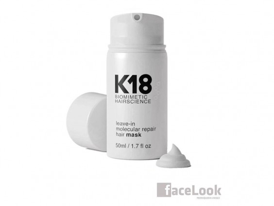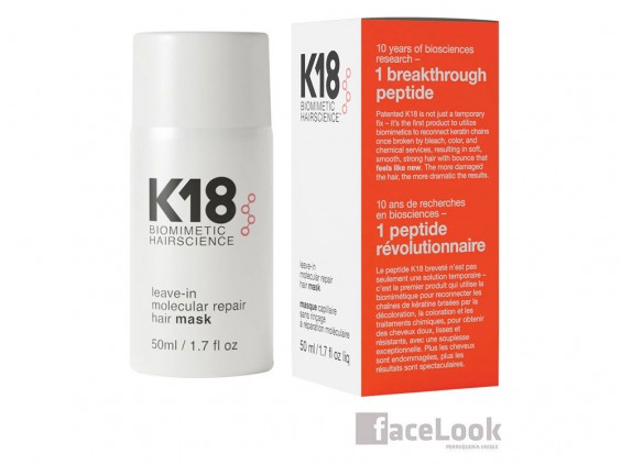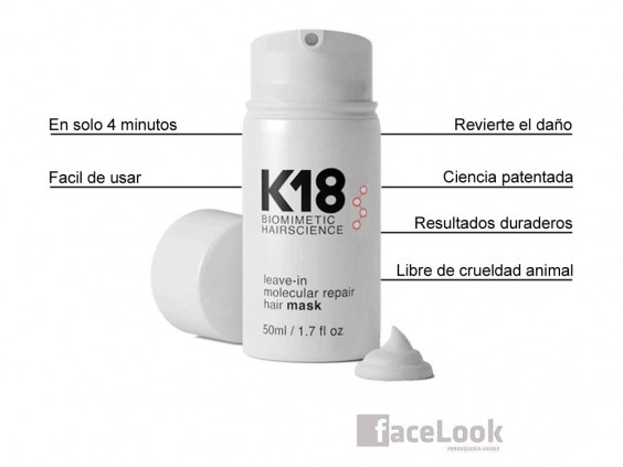 K18 biomimetic hairscience leave-in molecular repair hair mask. Ya está aquí la revolución en los productos de peluquería. Esta nueva mascarilla, elimina los daños del cabello en tan solo 4 minutos. Ya no nos tenemos que preocupar, por los daños de las decoloraciones, ni de las coloraciones. Es un producto vegano, que no está testado en animales. Elimina los daños ocasionados por los tratamientos químicos y las herramientas de calor. El péptido K18 es una secuencia única de aminoácidos que penetra en la hebra capilar y recompone los enlaces de disulfuro dañados.