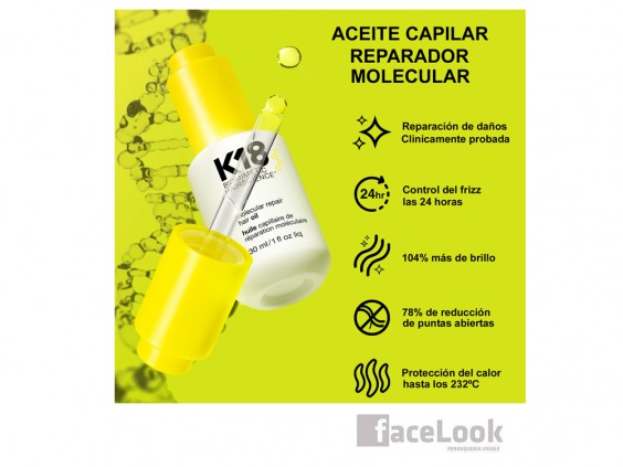 K18 biomimetic hairscience molecular repair hair oil. Es un aceite capilar sin peso. Repara los daños, fortalece, da brillo y reduce el encrespamiento, en dos niveles de la fibra capilar. K18 molecular repair hair oil, es un aceite sin silicona, que soluciona el encrespamiento a largo plazo, para alisar inmediatamente el frizz suelto. Trabaja en las capas más profundas del cabello, para repararlo y fortalecerlo.