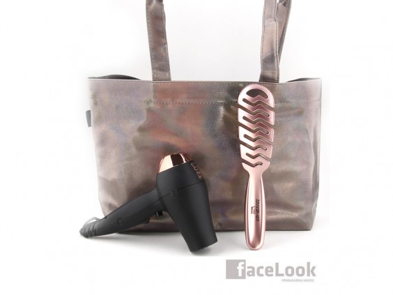 Dos herramientas de peluquería, ideales para llevar de viaje o al gimnasio. Trae un bolso tote bag de transporte de color rose gold, para guardarlas.