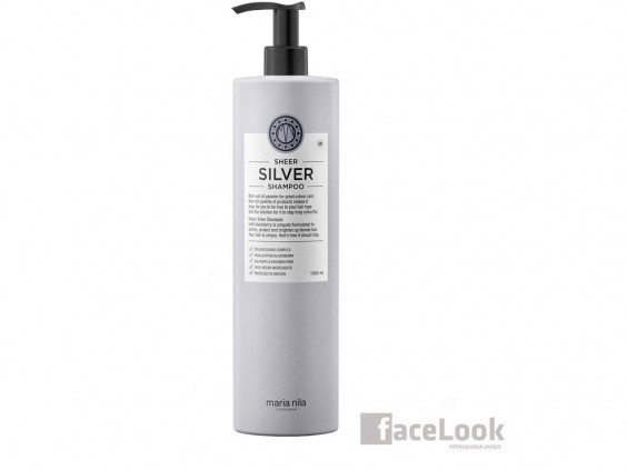Maria nila sheer silver champú. Ideal para cabello rubio. Neutraliza los tonos amarillentos, dándole brillo y fuerza. Un champú compuesto con pigmento violeta y extracto de mora, que ilumina los colores, realza los reflejos y neutraliza los tonos dorados. Sheer silver champú de Maria nila, tiene un aroma fresco y floral de jazmín, naranja y pomelo. Color Guard Complex, que preserva el color del cabello, protegiéndolo de la radiación UV y de los radicales libres.