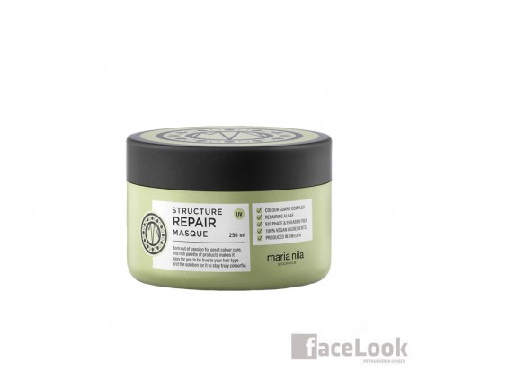 Maria nila structure repair mascarilla. Ideal para cabello dañado y seco. Tratamiento suave que evita la electricidad estática. Consigue un cabello con brillo, suave e hidratado y recupera su fuerza natural. Structure repair mascarilla de Maria nila, tiene un suave aroma a vainilla, rosa y jazmín. Color Guard Complex, que preserva el color del cabello, protegiéndolo de la radiación UV y de los radicales libres. Esta mascarilla está llena de nutrientes para restaurar el cabello y tiene un pH de 5-5,5 que es el pH natural de la piel y el cabello.