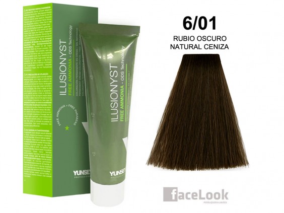 Yunsey tinte de pelo ilusionyst free ammonia 6/01 rubio oscuro natural ceniza. Coloración en crema sin amoniaco. En su lugar lleva monotanolamina, que se consigue el mismo efecto, pero es mucho menos agresivo. Más del 55% de su contenido, son aceites. Su fórmula a base de aceites, dan hidratación y suavidad al cabello. Compuesta por Abisinia, Aguacate, Almendras dulces y Argán. Tiene una cobertura muy buena, incluso en los cabellos con canas. Después del primer uso, se nota el pelo más sedoso, hidratado y brillante. Yunsey ilusionyst free ammonia, está compuesto de 55 tonos diferentes.