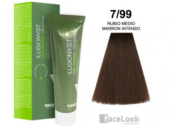 Yunsey tinte de pelo ilusionyst free ammonia 7/99 rubio medio marrón intenso. Coloración en crema sin amoniaco. En su lugar lleva monotanolamina, que se consigue el mismo efecto, pero es mucho menos agresivo. Más del 55% de su contenido, son aceites. Su fórmula a base de aceites, dan hidratación y suavidad al cabello. Compuesta por Abisinia, Aguacate, Almendras dulces y Argán. Tiene una cobertura muy buena, incluso en los cabellos con canas. Después del primer uso, se nota el pelo más sedoso, hidratado y brillante. Yunsey ilusionyst free ammonia, está compuesto de 55 tonos diferentes.